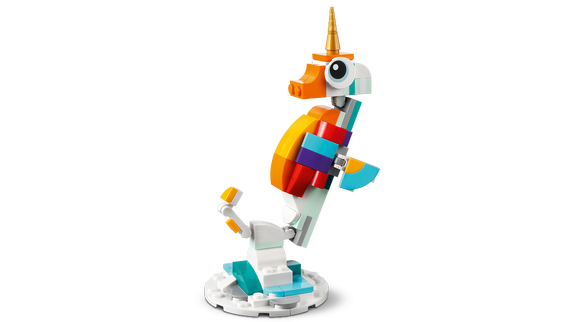 Fantasifulla barn från 7 år kan förflyttas till ett mytomspunnet land för förtrollande action med 3-i-1-byggsetet Magisk enhörning (31140). Setet har en leksaksenhörning med gyllene horn, färgglad svans och rörliga ben och hovar. Enhörningen kan ställas i 2 olika positioner, på 4 ben eller på sina 2 bakben för en ikonisk position, och visas upp på setets regnbågsställ. Bygg färgglada djur med LEGO® klossar Mytisk action som aldrig tar slut med 3 olika magiska varelser som små byggare kan sätta ihop i detta LEGO Creator 3in1-set. De kan bygga en rörlig magisk enhörning, bygga om den till en rörlig leksakssjöhäst med ett havsbottenställ eller förvandla den till en rörlig magisk påfågel med färgglad stjärt, eller till och med använda klossarna för att skapa en annan förtrollande varelse. Appen LEGO Builder Ladda ner appen LEGO Builder och kliv in i en ny värld av byggande, där barn kan zooma och rotera modeller i 3D, spara set och hålla reda på sina framsteg.