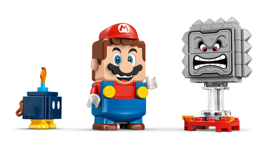 En interaktiv LEGO® Mario™ leksaksfigur, plus figurer av en Bob-omb och en Thwomp