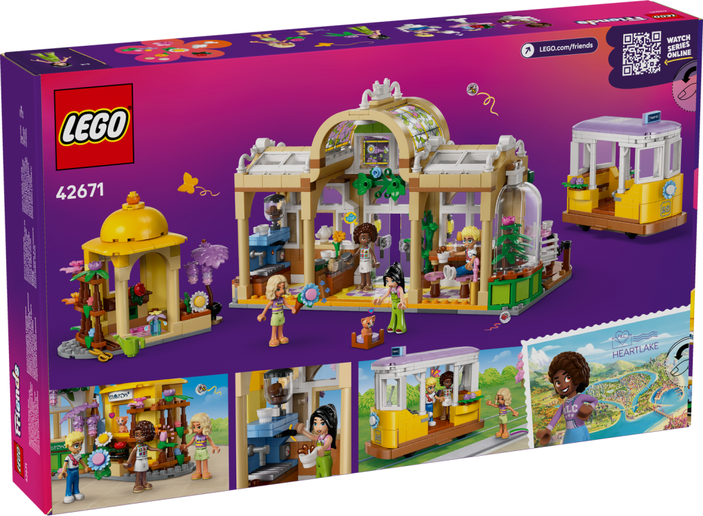 Ett byggset med en byggbar blomsteraffär och kafé, plus en spårvagn