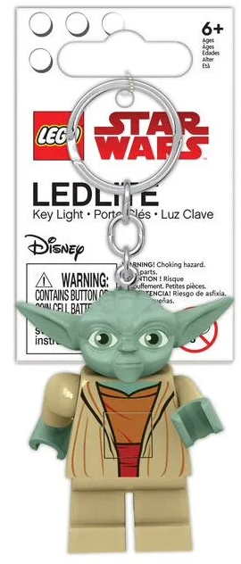 Nyckelring från LEGO med en rörlig Yoda-figur. Den har två starka LED-lampor under fötterna. Tryck på figurens överkropp för att tända lamporna och rör på benen för att rikta ljusstrålarna åt olika håll.