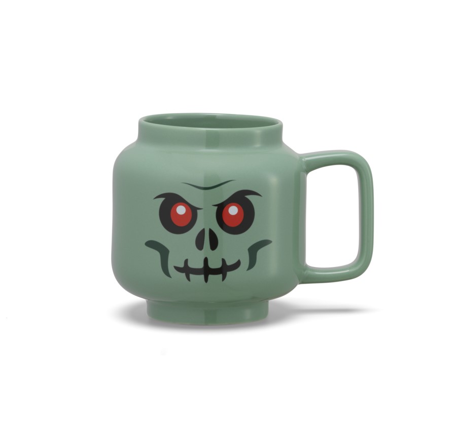 Stor minifigurmugg med skelett – Denna olivgröna keramikmugg är formad och dekorerad som ett stort LEGO® skelettminifigurhuvud