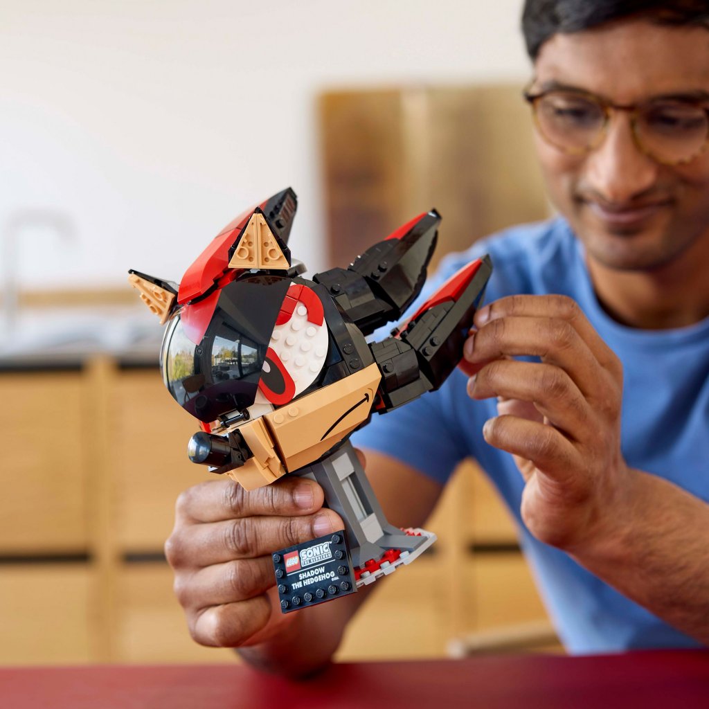 Detta bygg- och uppvisningsset med 720 delar, med Shadow the Hedgehogs huvud på ett ställ, är 20 cm högt, 17 cm brett och 21 cm djupt