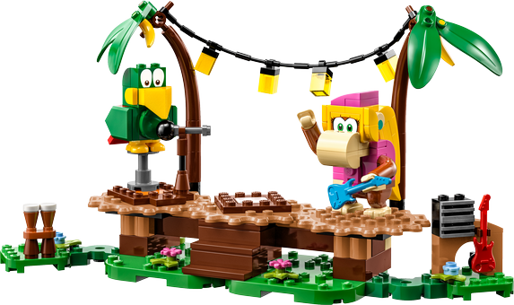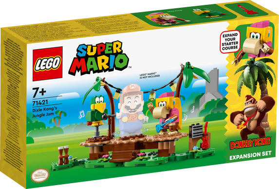 Barn kan ta sig hem till Donkey Kong™ i djungeln för musikaliska lekar med LEGO® Super Mario™ Dixie Kongs djungeljam – Expansionsset (71421). Setet innehåller figurer av Dixie Kong och papegojan Squawks, en byggbar scen, en djungelmiljö och musikinstrument och utrustning. Placera LEGO® Mario™, LEGO® Luigi™ eller LEGO® Peach™ (figurer ingår inte) mitt på scenen och vrid dem för att få de anslutna scenplattformarna att rotera och aktivera musikljud. Obs: Startbana 71360, 71387 eller 71403 behövs för interaktivt spel. Tillhörande app Ladda ner appen LEGO Super Mario för bygginstruktioner och annat roligt som förstärker ungas kreativa upplevelse. Presentidé Detta lekset att samla på blir en fantastisk present för kreativa barn från 7 år som älskar musik och djur – och vuxna med nostalgiska minnen av Donkey Kong kommer också att älska det! Detta och de många andra LEGO Super Mario expansionsseten låter fans utöka, bygga om och skapa sina egna banor för timmar av myntsamlarspel.