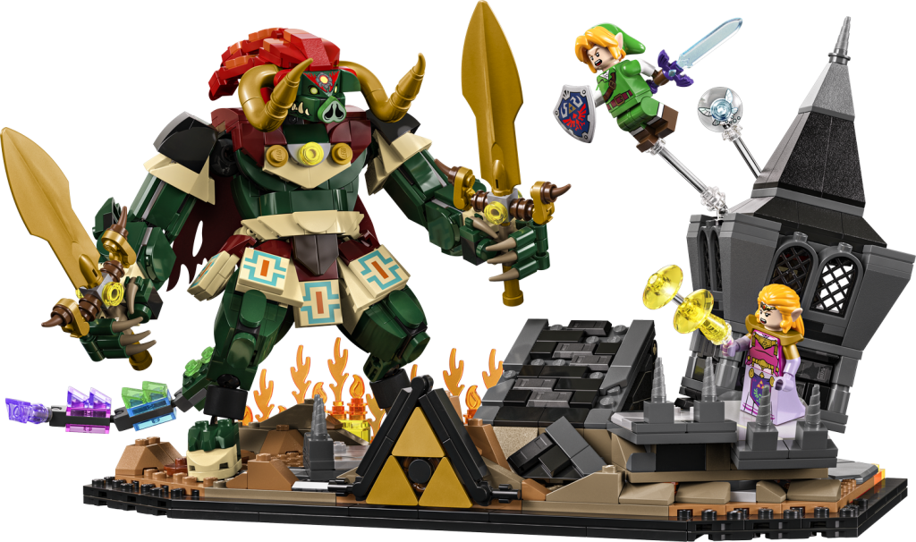 LEGO® minifigurer av Link, Zelda och Ganondorf, en stor figur av Ganon och en modell av Navi