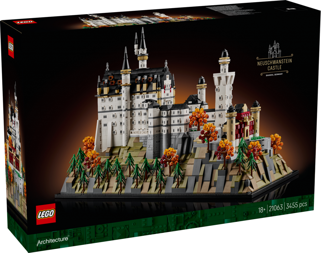 Denna uppvisningsmodell och arkitekturpresent med Slottet Neuschwanstein har 3 455 delar och är 31 cm hög, 46 cm bred och 20 cm djup