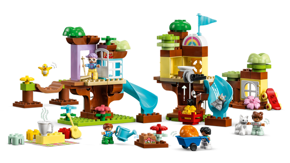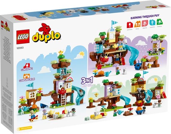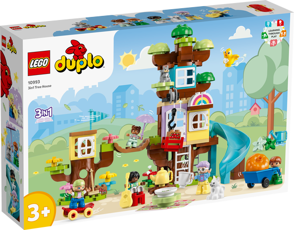 Små äventyrare från 3 år kan upptäcka otaliga sätt att ha roligt när de utforskar leksaken LEGO® DUPLO® 3in1 Trädkoja (10933). Setet har massor av funktioner att upptäcka och kan byggas om på 3 olika sätt för verkligt kreativt byggande. Lekbaserat lärande får fantasin att växa Barn kan först bygga den ultimata äventyrslekplatsen med 3 nivåer, en superlång rutschkana och en vinglig hängbro att ta sig över. Om regnmolnen hopar sig kan modellen byggas om till en mysig trädkoja. Den tredje modellen består av 2 trädkojor med varsin rutschkana och en trädgård där barn hjälper till att samla frukt och hissar upp den till trädkojan med en söt vinsch. Små barn lär genom lek Detta set innehåller en rad olika leksakskaraktärer, som en mormorsfigur, 4 barn, en fågel, en katt och en ekorre, så att föräldrar kan leka tillsammans med sina barn och lära dem sociala färdigheter och grupplek. Setet har även ett antal kreativa tillbehör så att små byggare kan utforska självuttryck medan de hittar på obegränsade, fantasifulla historier.