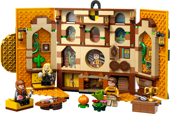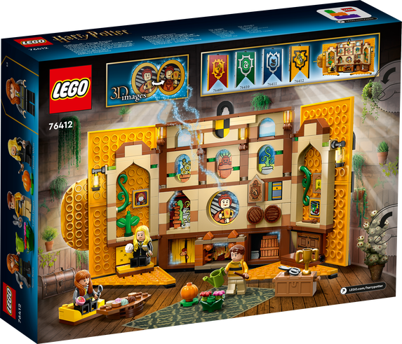 Barn kan bekänna färg med denna LEGO® Harry Potter™ Hufflepuff™ elevhemsbanderoll (76412). Setet har en tryckt platta av Hufflepuffs sköld och en hängare för att visa upp den på väggen. Den klossbyggda banderollen kan öppnas för att avslöja en detaljerad version av Hufflepuffs växtfyllda sällskapsrum med Hufflepuffs bägare, en pumpa, en byggbar kista och ett bord med olika matdelar. En inskjutbar linsformad bakgrund skapar magiska 3D-effekter, som en mandragora som hoppar upp och ner bakom gardinen och en nifflare som gömmer sig bakom en tunna och stjäl mynt. Setet innehåller dessutom minifigurer av Cedric Diggory, Susan Bones och Hannah Abbott med tillbehör. Lätt att transportera Leksetet, som är 1 av 4 Hogwarts™ elevhemsbanderoller att samla på, blir en cool present till barn från 9 år och är enkelt att förvara och ta med LEGO Builder Barn kan njuta av ett intuitivt byggäventyr med appen LEGO Builder, där de kan zooma in och rotera modeller i 3D, spara set och hålla reda på sina framsteg.
