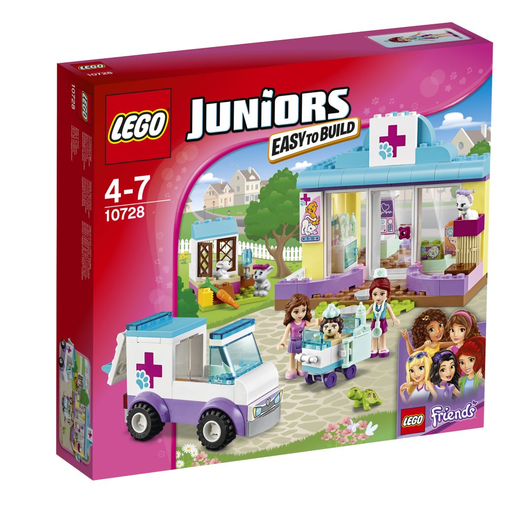 Var med när Olivia och Mia hjälper skadade och sjuka djur att bli friska igen på LEGO Juniors veterinärklinik! Öppna kliniken med Mia och förbered för dagens patienter. Berätta för Olivia om ett djur som måste hämtas med ambulans, och ta sedan emot henne när hon kommer. Ta in djuret på kliniken så att Mia kan börja behandla det. Ta hand om djuren tills de mår bättre!