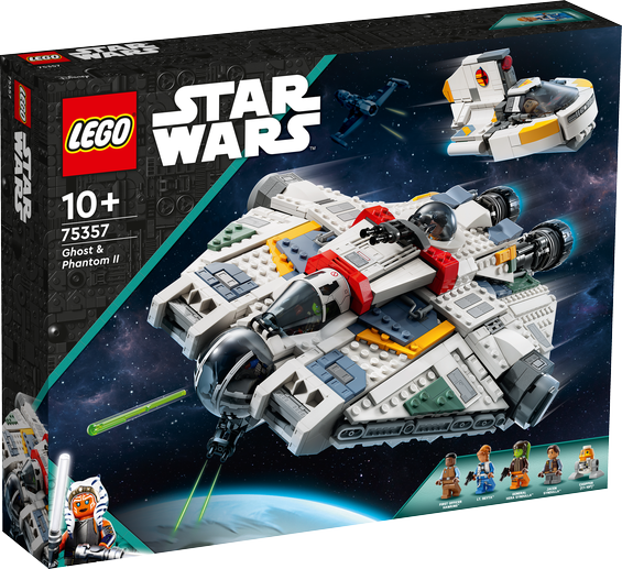 Fans kan iscensätta minnesvärda scener från Star Wars: Ahsoka med dessa LEGO® klossversioner av rymdskeppen Ghost & Phantom II (75357) rymdskepp. Den byggbara modellen av Ghost har 2 spakstyrda kanoner med fjädermekanism, dubbel LEGO minifigurcockpit med en avtagbar främre sektion och kabin med 2 öppningsbara luckor, avtagbart torn med en kanon (kan ej avfyras) och plats för en LEGO minifigur. Rymdfärjan Phantom II har en öppningsbar minifigurcockpit och ett förvaringsutrymme. Dessutom ingår 5 Star Wars karaktärer, däribland en LEGO minifigur av general Hera Syndulla och en LEGO droidfigur av Chopper (C1-10P). Ett nytt sätt att bygga Ge den kreativa upplevelsen ytterligare en dimension med appen LEGO Builder, med verktyg för att zooma in och rotera digitala 3D-versioner av de verkliga byggmodellerna, hålla reda på framsteg och spara set. Presentidé Denna byggleksak blir en grym present till barn från 10 år och ingår i ett enormt sortiment av LEGO Star Wars set som kommer att uppskattas av Star Wars fans i alla åldrar.