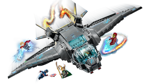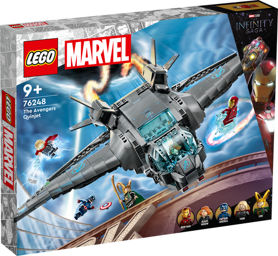 LEGO® Marvel Avengers Quinjet (76248) är en autentisk kopia av det berömda superhjälteplanet som barn från 9 år kan bygga, visa upp och färdas med genom universum på oändliga äventyr med Avengers. Imponerande detaljrikt och ändringsbart Denna detaljerade kopia av det berömda rymdskeppet Quinjet från Marvels filmer om Avengers har öppningsbar cockpit, passagerardel och bakre del, plus ett infällbart underrede och justerbara vingar. Setet innehåller även många tillbehör och 5 ikoniska minifigurer: Black Widow, Thor med sin hammare, Iron Man, Captain America med sin sköld och Loki med sin spira. Barn kan välja mellan 2 klistermärkesark för att dekorera Quinjet med antingen Avengers- eller S.H.I.E.L.D.-dekaler. Och när Quinjet inte inspirerar till oändliga fantasifulla äventyr ser skeppet fantastiskt ut när det visas upp på sitt visningsställ i barns sovrum. Ännu mer digitalt skoj finns i appen LEGO Builder, med intuitiva verktyg för att zooma och rotera som låter barn visualisera sinmodell medan de bygger.